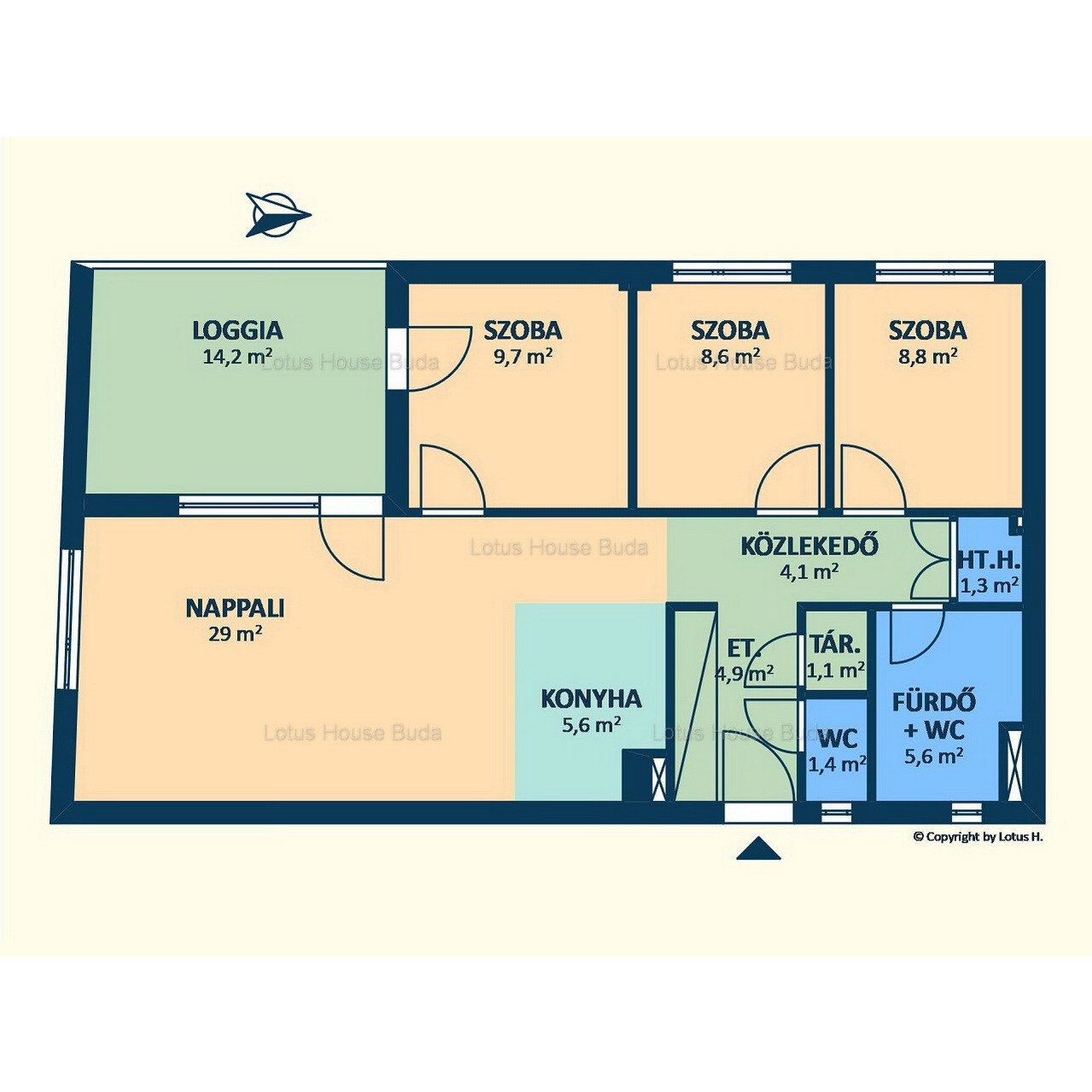 A lakás alapterülete 80nm, amit a 14,2nm nagyságú loggia nagyobbít. A nappali a konyhával 34,6nm, a szobák 9,7nm, 8,6nm és 8,8nm, nagyságú.