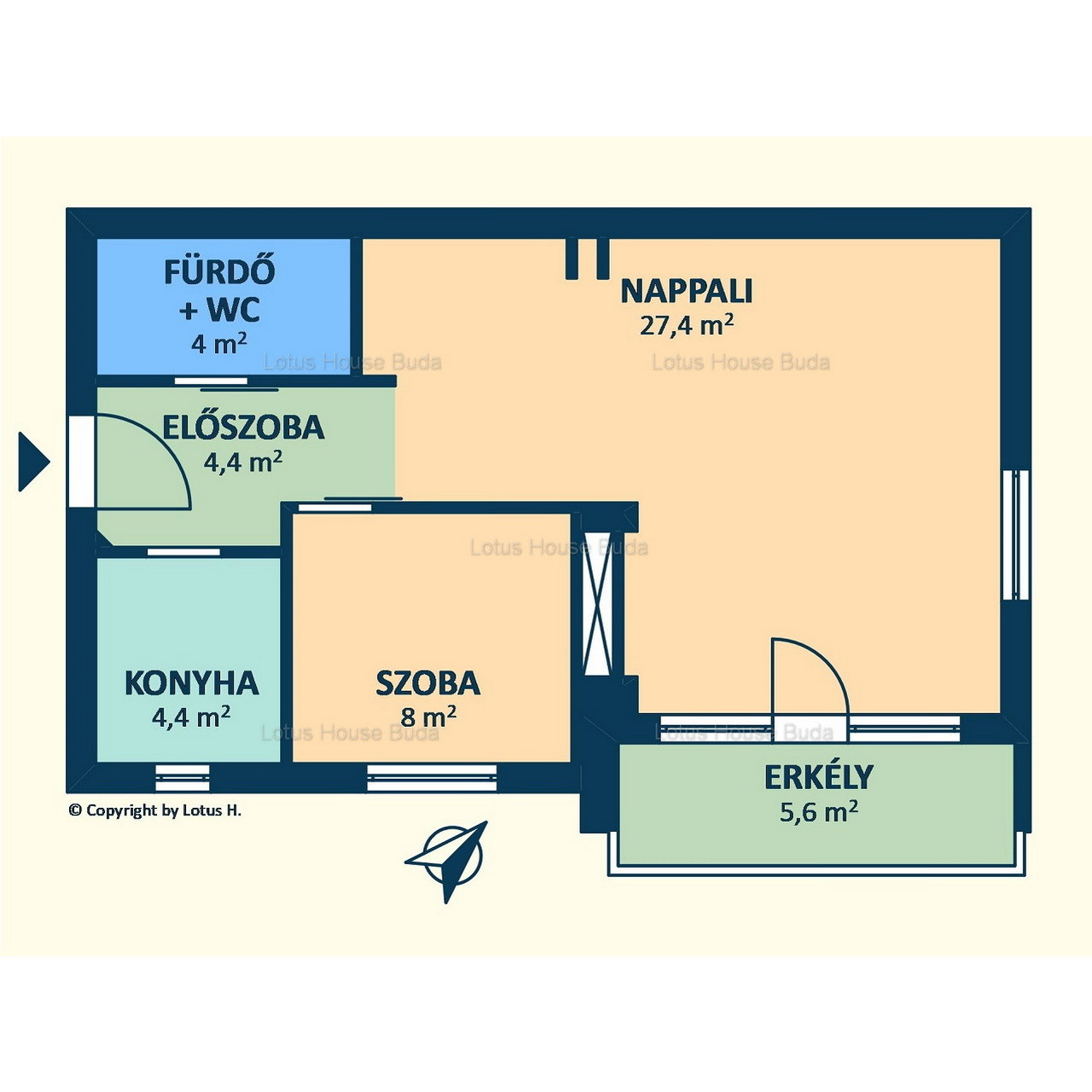 A lakás alapterülete 54nm. A nappali 27,4nm, a szoba 8nm, az erkély 5,6nm.