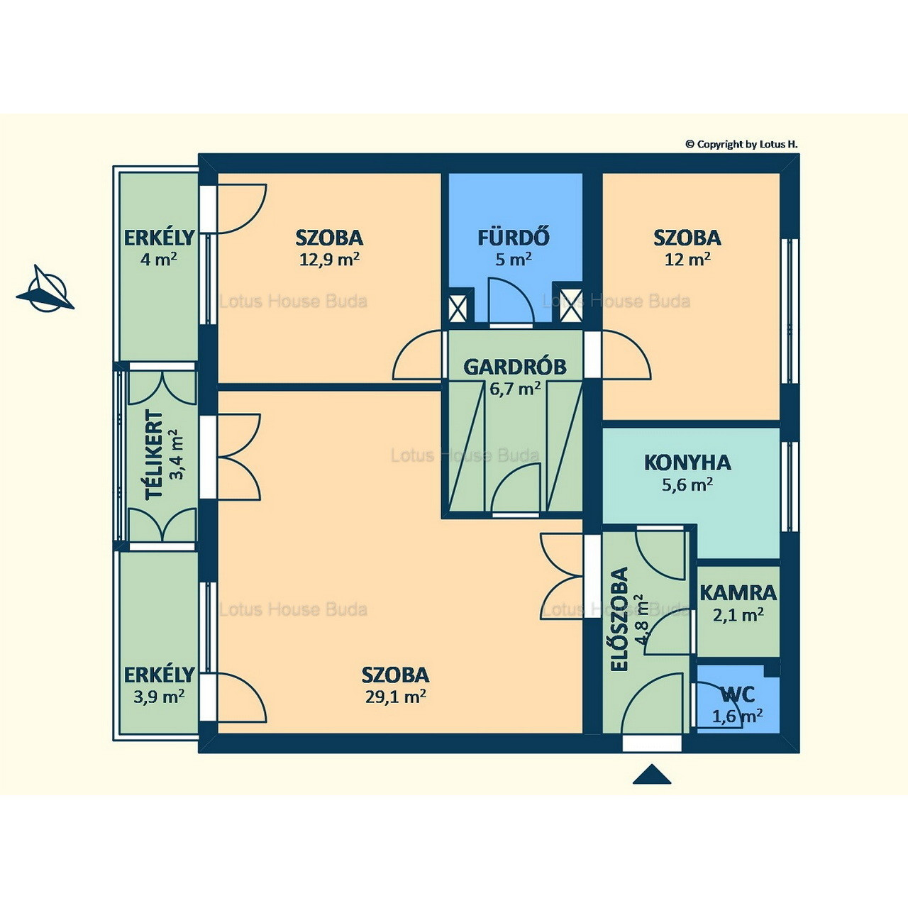 A lakás alapterülete 80nm, amit a két erkély és a télikert nagyobbít. A szobák 29,1nm, 12,9nm és 12nm nagyságúak.
