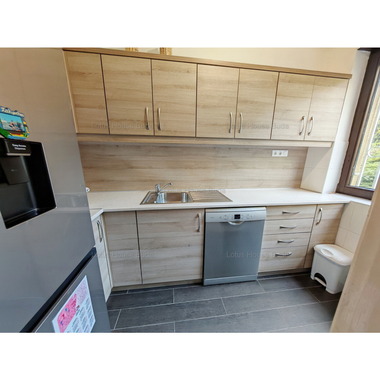 A kiadásra kínált lakás a ház alsó lakószintjén helyezkedik el, de a telek adottságai miatt erkélye emelet magasságban van. Az utcáról is, a garázsoktól is lépcsőkön közelíthető meg a bejárat. A lakásban 2006-ban nagyobb felújítás történt, így cserére kerültek a csövek is, hőszigetelt dupla üvegezésűek az ablakok, míg a mostani konyha 2010-ben készült.