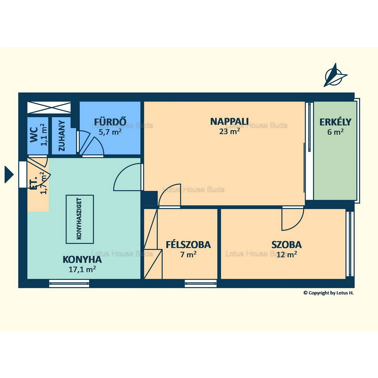 A lakás alapterülete 71nm, amit a 6nm nagyságú erkély nagyobbít. A nappali 23nm, a két háló 12nm és 7nm, az étkező konyha 17,1nm.
