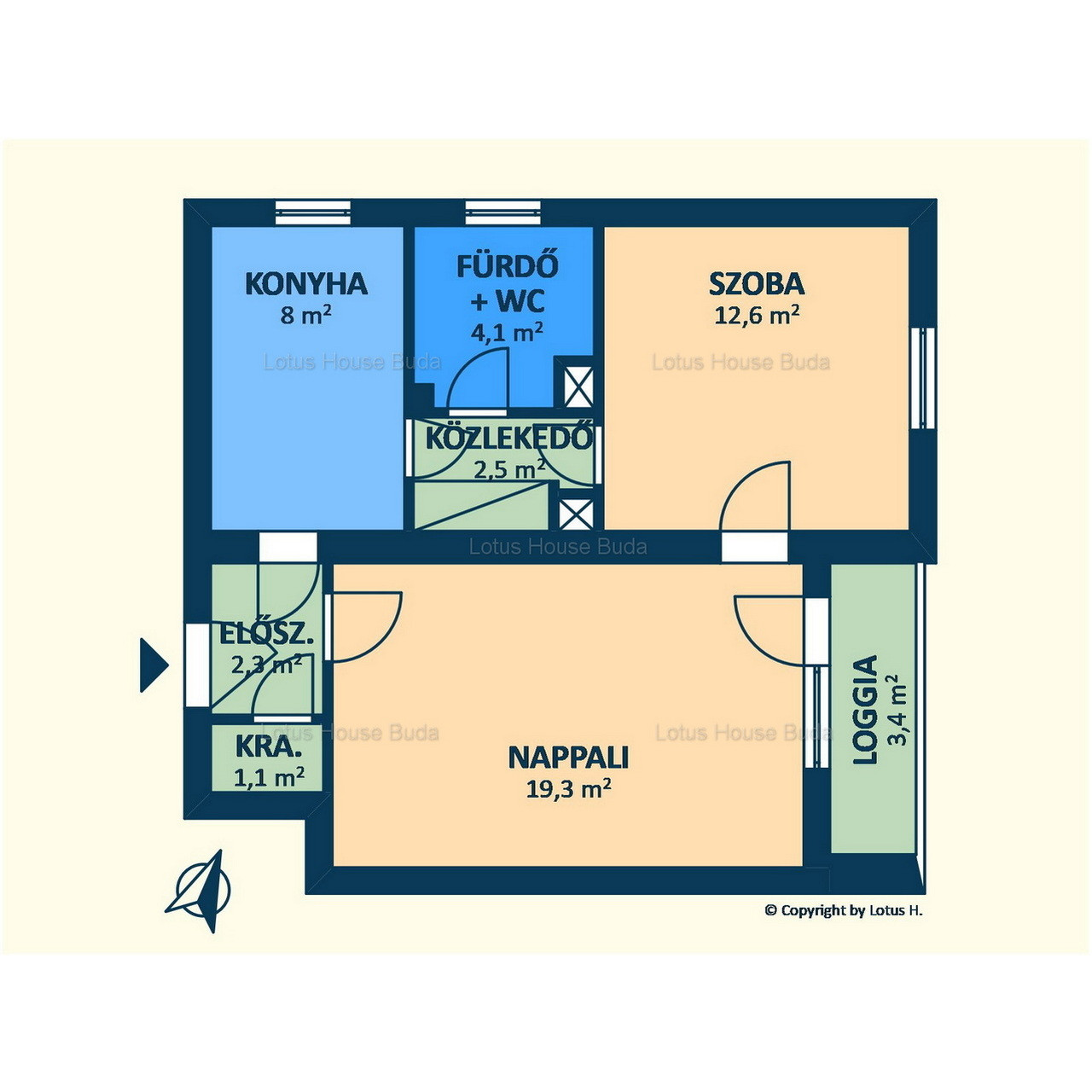 A lakás alapterülete 54nm. A szobák 19,3nm és 12,6nm, a konyha 8nm míg az erkély 3,4nm nagyságú.