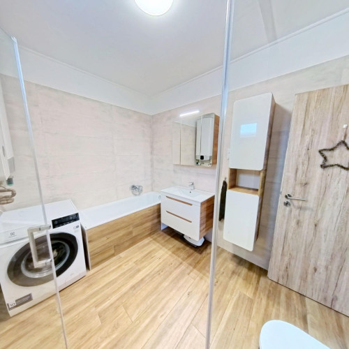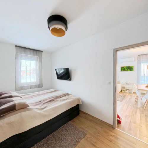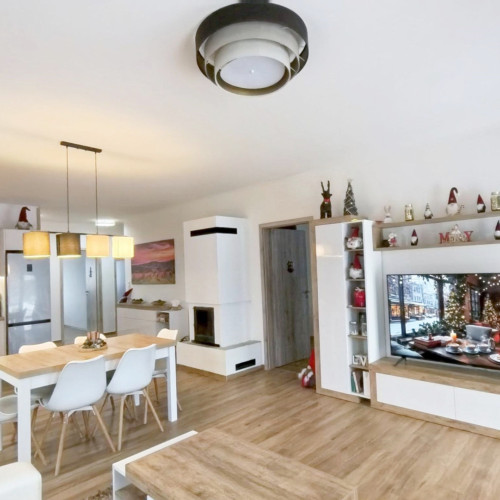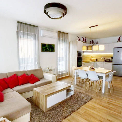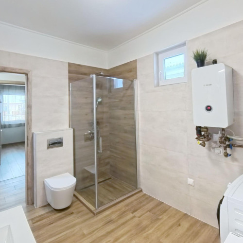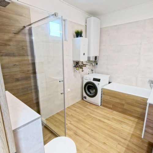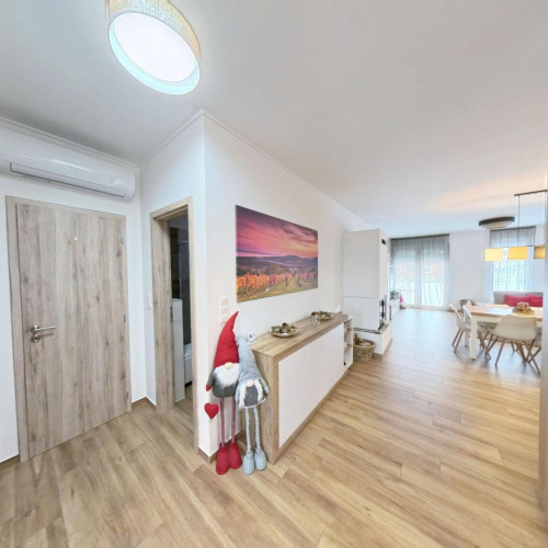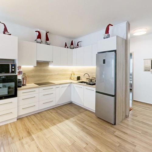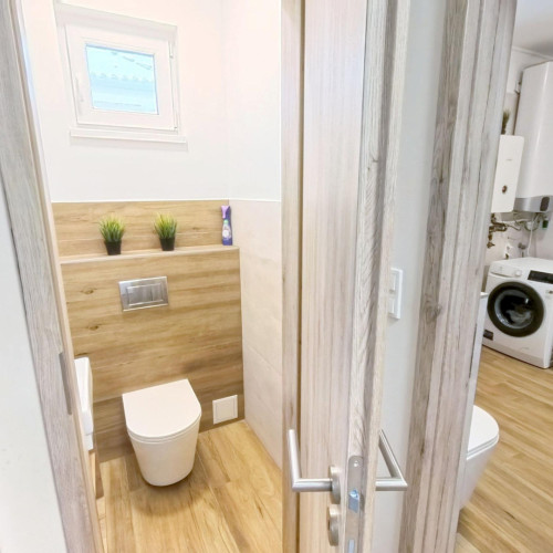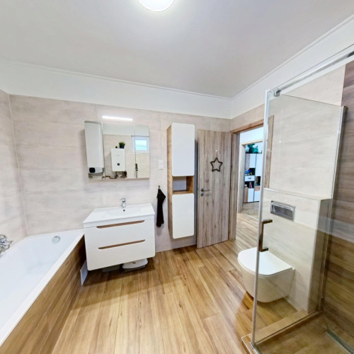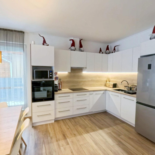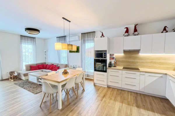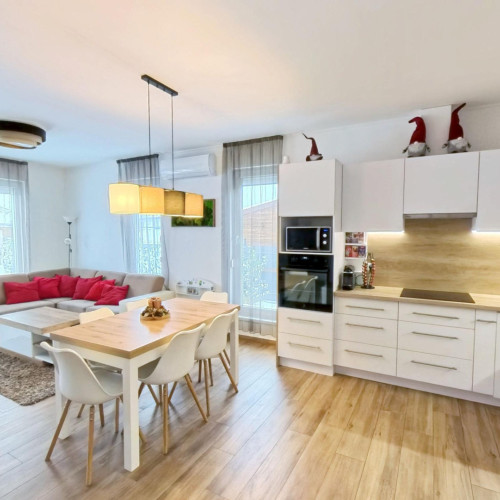 A fürdőszobában kapott helyet a BOSCH ELEKTROMOS KAZÁN és az ARISTON okos villanybojler is. A bejárattól jobbra a konyha-étkezőbe juthatunk, amely egy légtérben van a nappalival. A konyhában EGYEDI TERVEZÉSŰ, IGÉNYESEN BEÉPÍTETT, MODERN KONYHABÚTOR van, melyben minden fontos konyhai gép (Elektrolux sütő és indukciós főzőlap, Bosch mosogatógép, szag elszívó) beépítésre került.